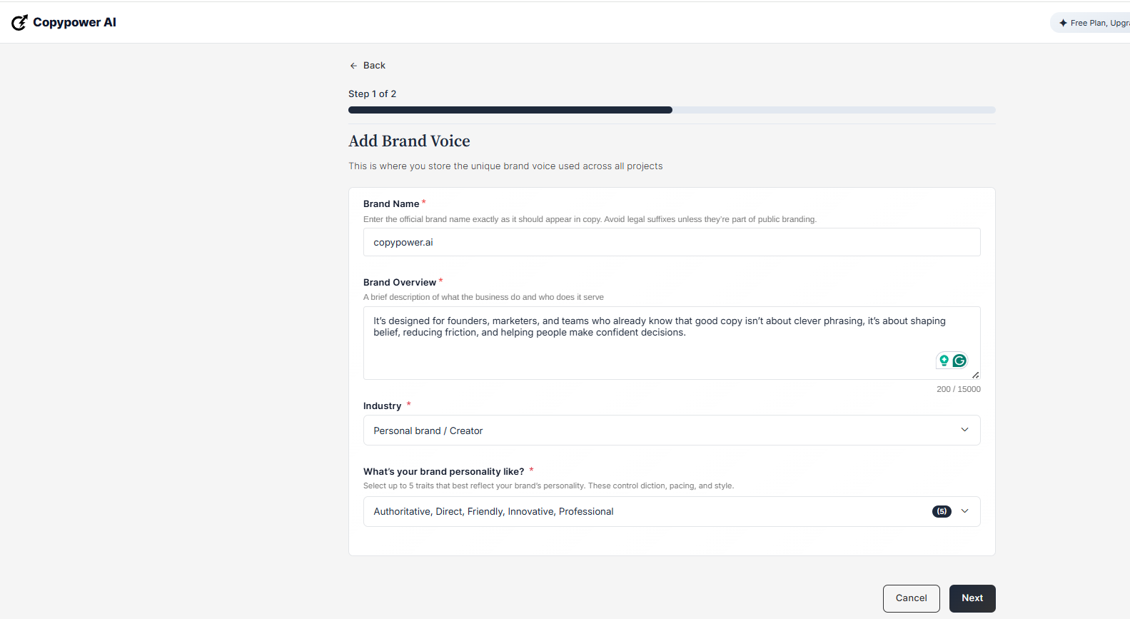 From these inputs, CopyPower.ai pre-fills several strategic fields in Step 2.